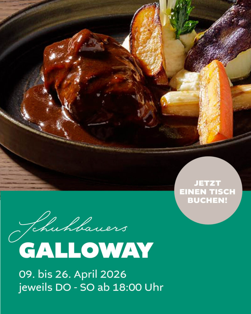 Lassen Sie sich überraschen und genießen Sie während unserer Galloway-Wochen die besonderen Gerichte, die wir für Sie auf unserer Karte haben. Infos zur Speisekarte finden Sie in Kürze auf unserer Website.
